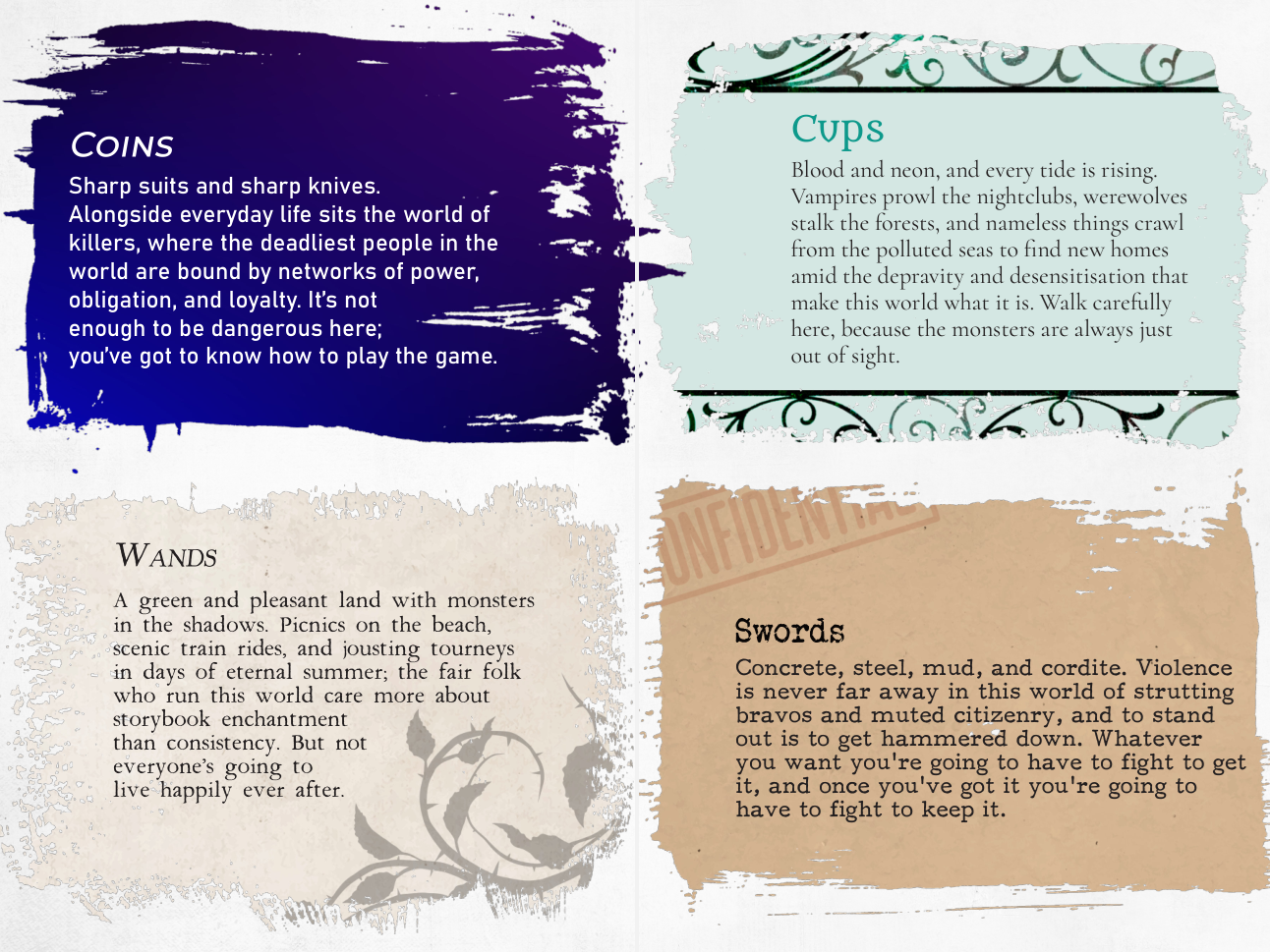 Wands is unlike the others: a world of green forests and golden corn, of fairy tales and legends, where gunpowder is inert, romance is treasured, and matters of honour are settled with cold steel. The fey rule this world openly as its Court, and all others are merely background characters in the stories they tell.