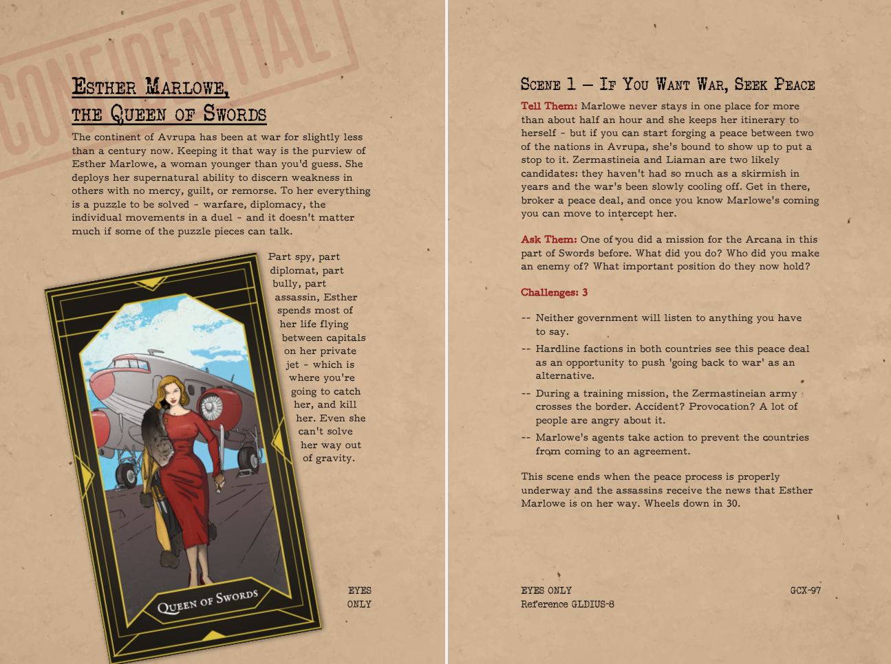 Sixteen possible hits are detailed in the book, covering three stages of narrative progression and rules for a showdown against the target including several different battlefield shifts to make the player-characters' lives difficult.